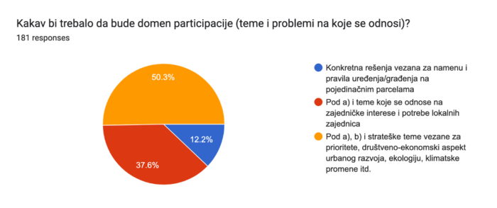 Polovina ispitanika (50,3%) smatra da bi participacijom morale biti obuhvaćene i strateške teme (prioriteti, društveno-ekonomski aspekt urbanog razvoja, ekologija, klimatske promene itd.) i interesi lokalnih zajednica, dok više od trećine (37,6%) vidi njen domen samo u rešavanju potreba i interesa na nivou lokalnih zajednica. Za 12% planera uključenih u ispitivanje, participacija predstavlja sredstvo rešavanja konkretnih/privatnih interesa na pojedinačnim parcelama.