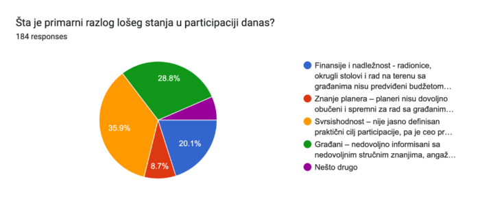 Više od trećine ispitanika vidi odsustvo svrsishodnosti participacije kao primarni razlog lošeg stanja u participaciji (36%), dok skoro 30% ispitanika kao primarni uzrok lošeg stanja u participaciji vidi građane, odnosno smatra da su građani nedovoljno informisani, sa nedovoljnim stručnim znanjima, da su angažovani u malom procentu zbog čega se ne može reći da predstavljaju mišljenje i zahteve većine, kao i da nisu spremni na dijalog i kompromise.