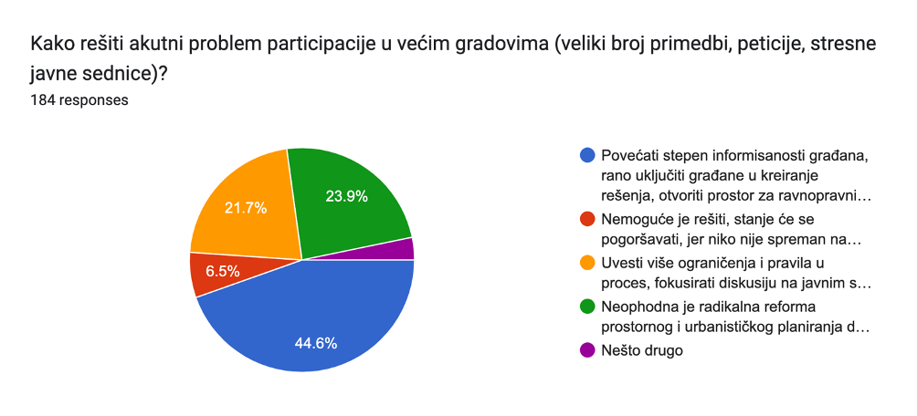 Skoro 45% ispitanika rešenje akutnih problema participacije u većim gradovima (veliki broj primedbi, peticije, stresne javne sednice) vidi u otvaranju procesa za javnost, ranom uključivanju građana u proces planiranja i stvaranju uslova za ravnopravni dijalog, odnosno trenutno stanje vidi kao posledicu manjka svrsishodne uključenosti građana i loše komunikacije sa građanima, za koju je odgovorna uprava koja vodi proces.