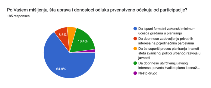 Čak skoro dve trećine ispitanika (65%) misli da uprava očekuje od participacije da osigura ispunjavanje zakonom propisanog minimuma uključivanja građana, odnosno da uprava posmatra participaciju isključivo kao sredstvo ispunjavanja formalne obaveze. Skoro petina ispitanika (18,4%) misli da uprava ipak očekuje da participacija poveća kvalitet plana, osnaži zajednicu i da doprinos utvrđivanju javnog interesa. Oko 9% ispitanika misli da uprava i donosioci odluka očekuju da će se kroz participaciju namiriti privatni interesi na pojedinačnim parcelama, a 5% ispitanika misli da neke uprave participaciju vide kao potencijalnu štetu po proces planiranja i zvaničnu politiku grada.