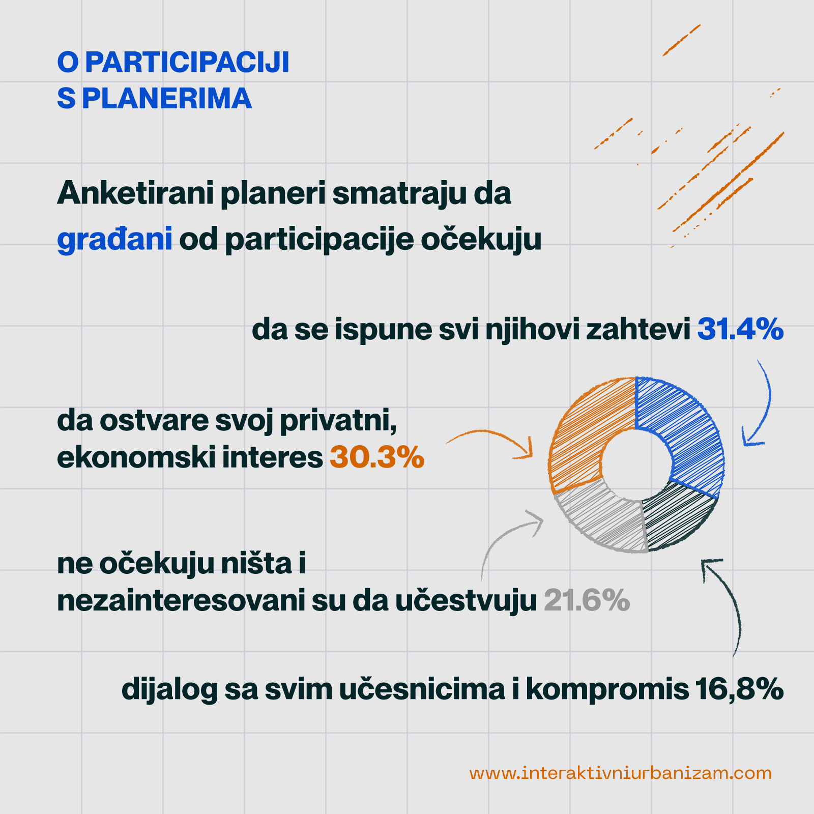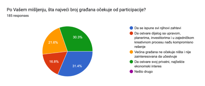 Nešto više od 30% ispitanika misli da građani očekuju da kroz participaciju ostvare svoj privatni, najčešće ekonomski interes. Približno jednak broj anketiranih građane sagledava veoma radikalno. Naime, oko 30% ispitanika smatra da građani očekuju da se kroz participaciju ispune svi njihovi zahtevi. Nešto više od petine ispitanika (21,6%) misli da građani u najvećoj meri nisu uopšte zainteresovani za participaciju. Samo 17% percipira građane dominantno kao spremne na dijalog sa upravom, planerima, investitorima i spremne na kompromis radi nalaženja najboljeg rešenja.