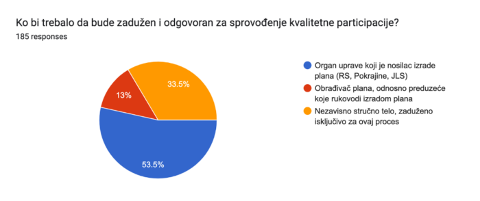 Više od polovine ispitanika (53,5%) misli da bi sprovođenje kvalitetne participacije trebalo da bude odgovornost organa gradske uprave, kao nosioca izrade plana, što odgovara sadašnjim propisima. Trećina ispitanika vidi rešenje u novom, nezavisnom, stručnom telu koje bi bilo isključivo zaduženo za ovaj proces. Oko šestina ispitanika (13%) smatra da bi odgovornost za sprovođenje i obezbeđenje kvaliteta participacije trebalo da bude odgovoran obrađivač plana, koji i radi na planskom rešenju.