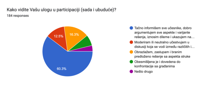 Tri petine ispitanika (60%) vidi svoju ulogu u participaciji kao aktivnog učesnika – onog koji informiše, argumentuje, iznosi dileme, daje varijante itd. Ovakav rezultat može se smatrati veoma pozitivnim za jačanje pozicije struke, s obzirom na to da opisana aktivna uloga u participaciji podrazumeva spremnost na iznošenje ličnih stavova, sagledavanje problema iz različitih uglova, razumevanje različitih interesa, nepristrasnost, pa i etičnost.