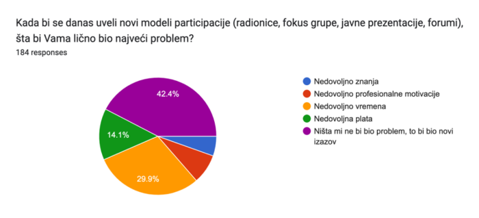 - Kada bi se danas uveli novi modeli participacije (radionice, fokus grupe, javne prezentacije, forumi), šta bi Vama lično bio najveći problem?