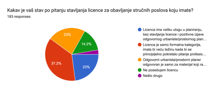 Prikupljeni stavovi koji su skoro ravnomerno podeljeni a suštinski različiti, ukazuju na odsustvo sistemskog okvira za definisanje značaja i odgovornosti koju nosi posedovanje licence i pozicija odgovornog urbaniste/prostornog planera, koje može biti od presudnog značaja za ulogu i moć planera u procesima urbanističkog i prostornog planiranja.