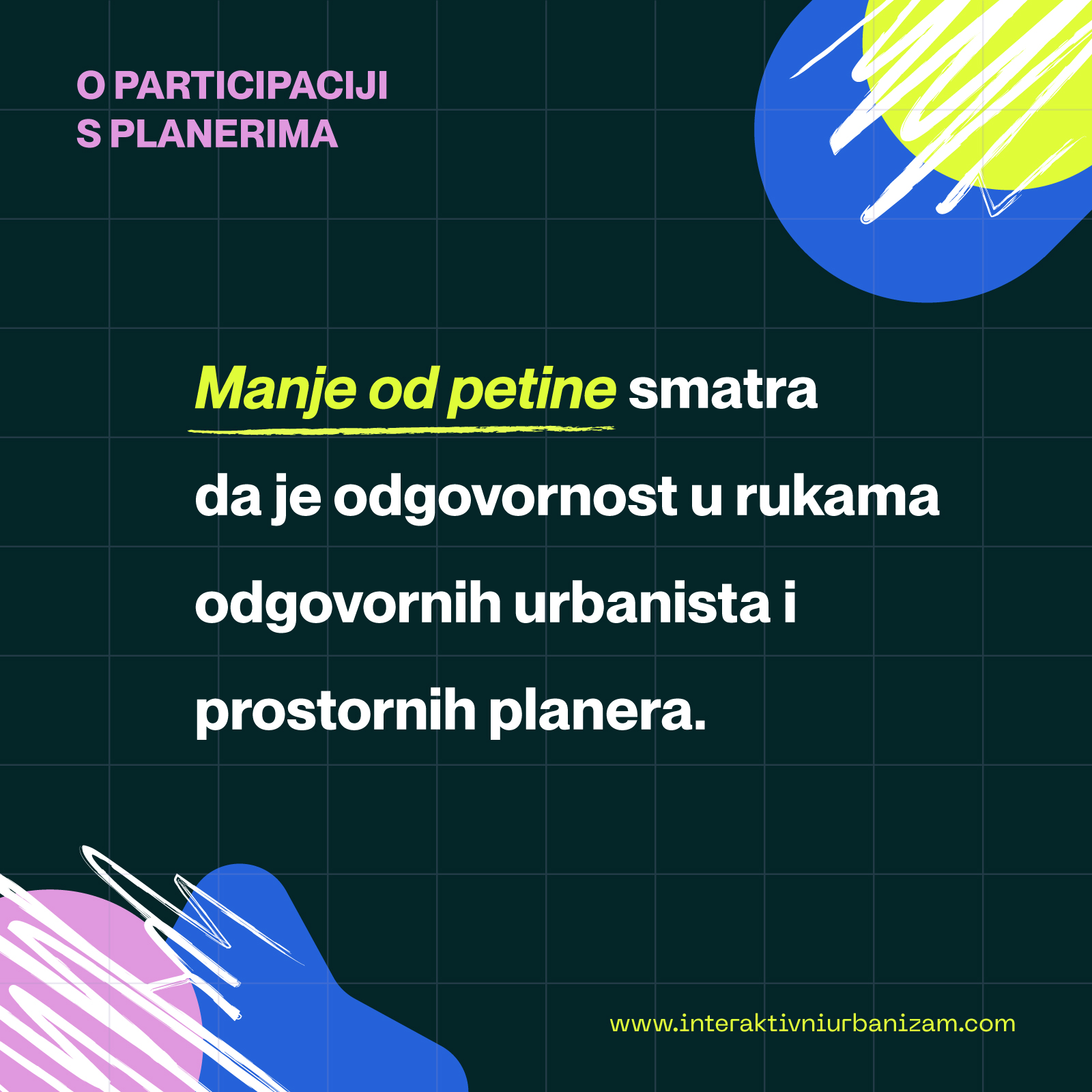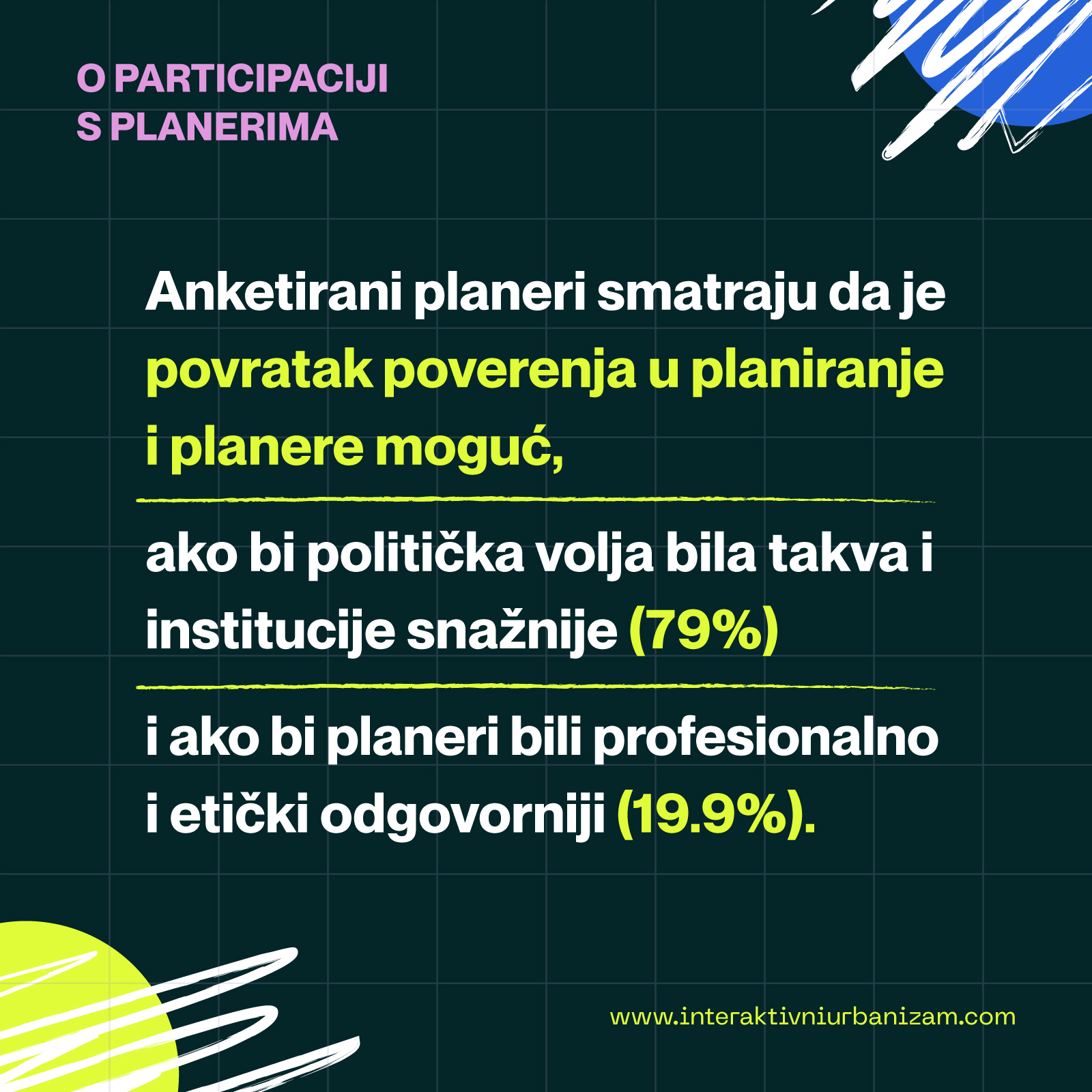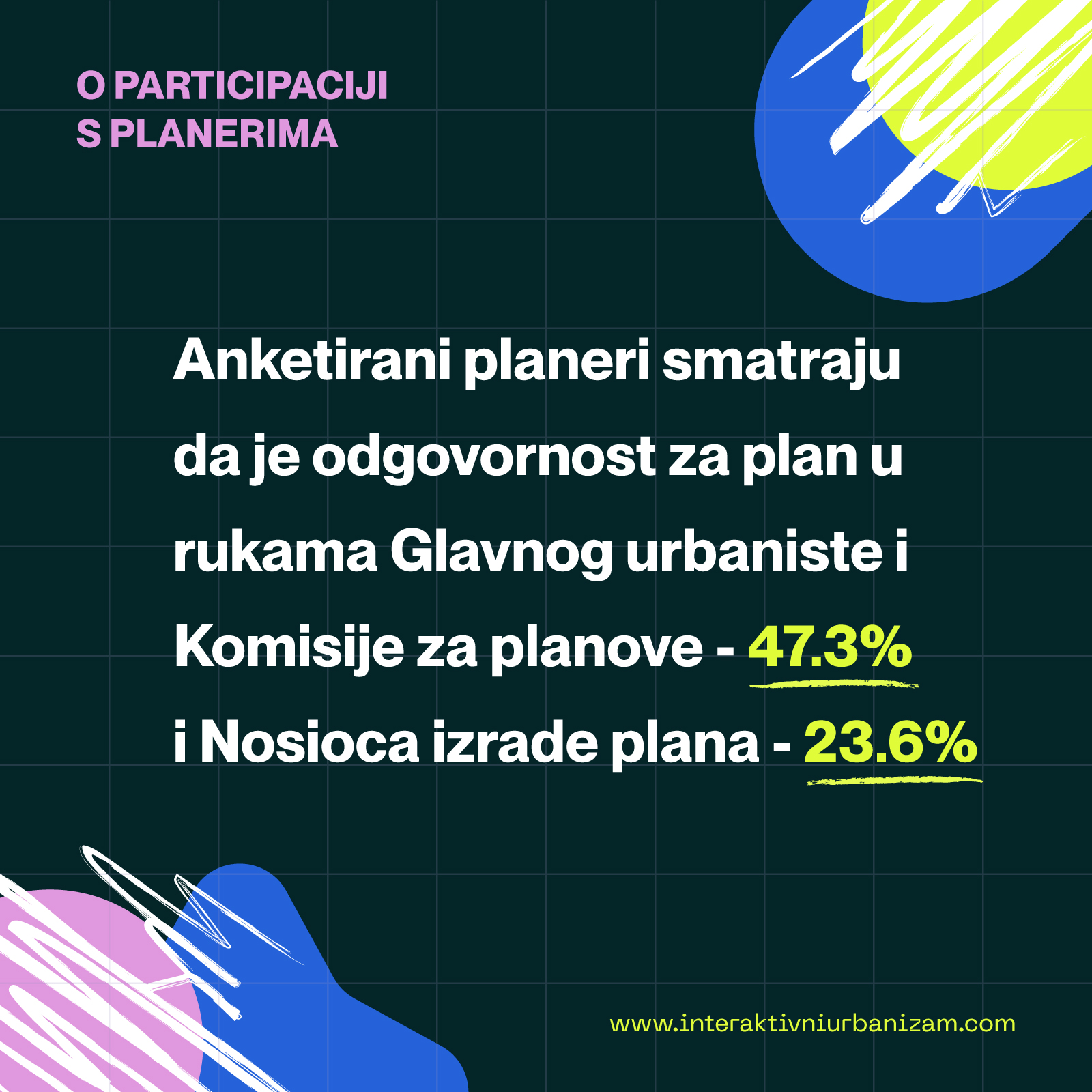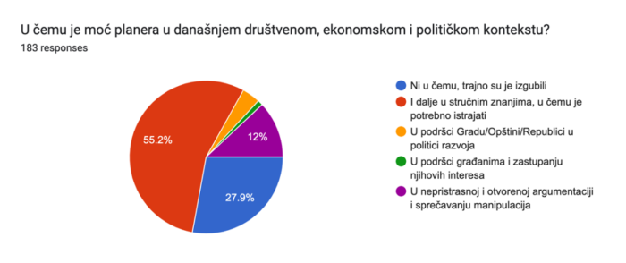 Alarmantno je što je uticaj planera na plansko rešenje viđen kao minimalan (svega 8%), dok većina anketiranih smatra da su, u postojećem procesu, investitori krupnog kapitala u sprezi s politikom ti koji oblikuju plansko rešenje.