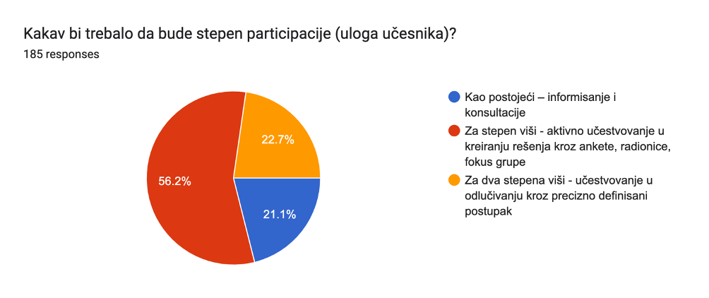 Više od polovine ispitanika misli da bi, pored postojećeg konsultovanja, građani trebalo aktivno da učestvuju i u kreiranju rešenja (56,2%), dok skoro četvrtina (22,7%) misli da bi građani morali da imaju ulogu i u odlučivanju (ukupno skoro četiri petine ispitanika). Postojećim stepenom participacije, tokom koje se građani samo informišu i konsultuju, zadovoljno je tek nešto više od petine ispitanika (21,1%).