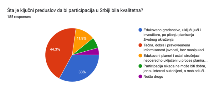 Skoro 45% smatra da je dobro i nemanipulativno informisanje ključni preduslov poboljšanja kvaliteta participacije u Srbiji, odnosno da nikakva druga posebna znanja ni sredstva nisu preko potrebna, ali je potrebna volja da proces bude transparentan i otvoren. Trećina ispitanika (33%) kao preduslov kvalitetne participacije vidi edukaciju stanovništva i investitora, što zahteva značajna ulaganja u sistemsku edukaciju u dugom vremenskom periodu i na različitim nivoima. Oko 12% problem vidi u neznanju planera i drugih stručnjaka neposredno uključenih u proces planiranja, o svrsi, metodama i tehnikama participacije, što zahteva ulaganje u edukaciju planera u cilju promene svesti i stavova onih koji vode proces. Oko 6% misli da poboljšanja ne može biti jer su interesi sukobljeni, a moć odlučivanja centralizovana, što takođe ukazuje na potrebu za sistemskom promenom načina na koji se pristupa participaciji, odnosno procesima izrade planskih dokumenata.