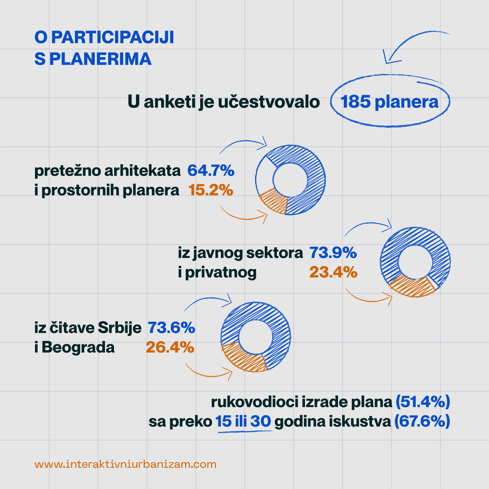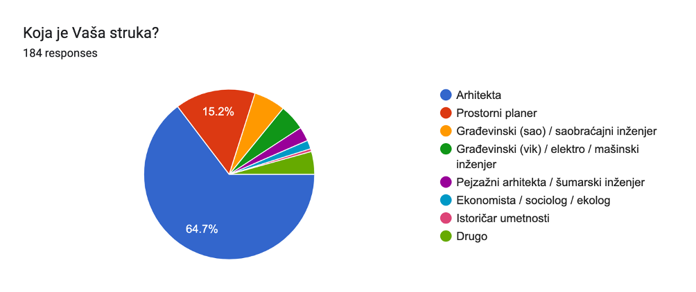 U anketi je učestvovalo 185 planera. Od toga najvećim udelom arhitekte, preko 60%, dok je 15% prostornih planera, 11% građevinskih saobraćajnih inženjera, a preostalih 14% drugi građevinski inženjeri, pejzažne arhitekte, i drugo. Velika većina anketiranih, skoro 74%, zaposlena je u javnom sektoru. Četvrtina anketiranih zaposlena je u privatnom sektoru (23.4%), dok iz civilnog sektora dolazi tek nešto manje od 3% odgovora. Anketirani pretežno rade na teritoriji većih opština i gradova Srbije, zatim Beograda, a onda na nivou Republike Srbije i na teritoriji manjih opština i naselja u Srbiji.