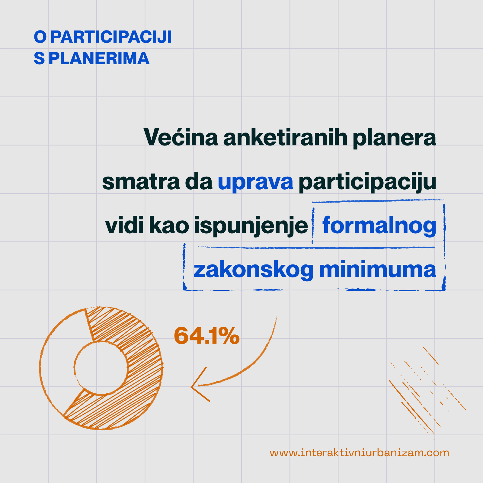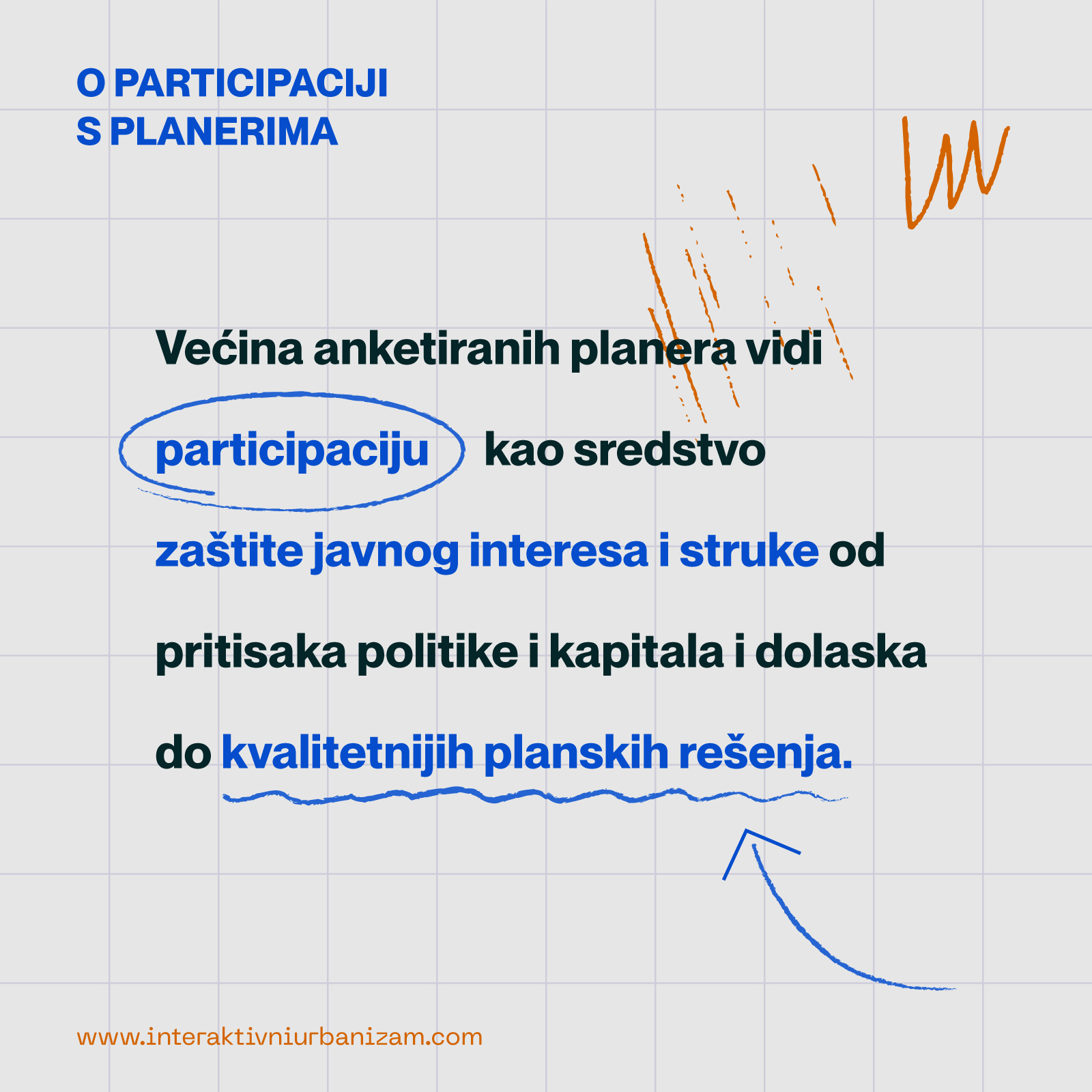 Pozitivan odnos spram pariticipaciji, procedurama koje omogućavaju učešće šire javnosti u planiranju, iskazalo je tri četvrtine ispitanika. Među njima, skoro polovina (47,8%) vidi participaciju kao sredstvo zaštite javnog interesa i struke od pritisaka politike i kapitala, a nešto više od četvrtine (27,2%) vidi participaciju kao direktno sredstvo dolaska do kvalitetnijih rešenja. Nešto više od šestine ispitanika (17,4%) smatra da participacija narušava proces planiranja, ali za to “krivi” trenutne društvene okolnosti pune tenzija. Najmanji broj ispitanika (5,4%) vidi participaciju isključivo kao zakonom nametnutu obavezu koja često ne poboljšava već degradira kvalitet plana.
