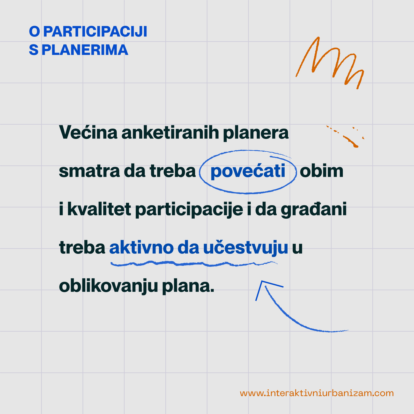 Učešće građana u procesima izrade i usvajanja plana je većinski viđeno kao doprinos boljim planskim rešenjima, zaštiti javnog interesa i struke, koji treba razvijati i unaprediti, počevši od načina informisanja javnosti, pa čak i davanja značajnije uloge građanima u ovom procesu odlučivanja. Istovremeno, pozitivno je što većina anketiranih vidi sebe, tj. planere, kao aktivne učesnike u ovom procesu.