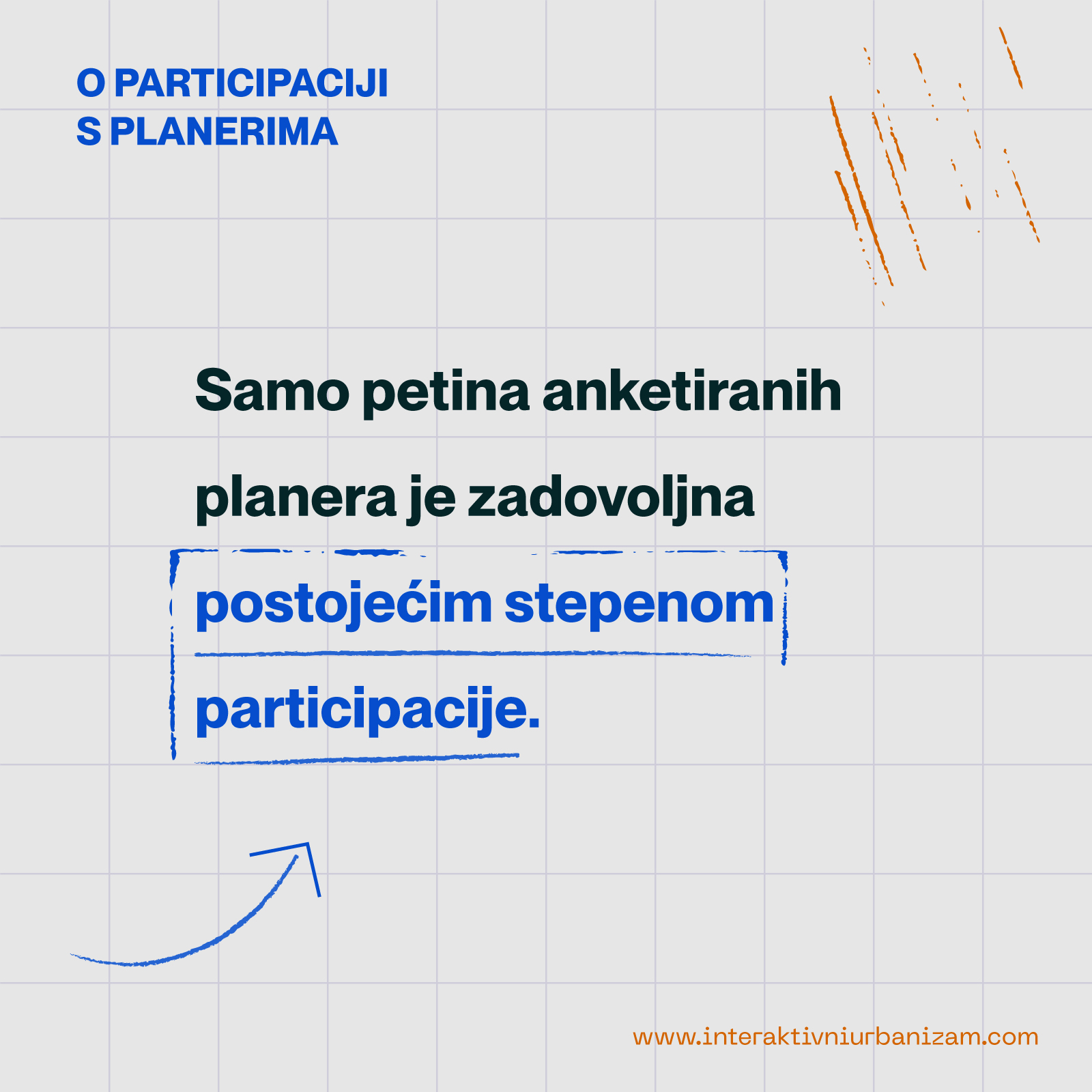 Postojećom participacijom, kojim se građani samo informišu i konsultuju, zadovoljan je jako mali udeo anketiranih. Uzroci lošeg stanja viđeni su primarno u tome što ona nema svrhu, ali i u tome što građani nisu dovoljno informisani, obučeni i spremni da u njoj učestvuju, nezainteresovani su ili pak, teže pukom ostvarivanju svojih ličnih interesa. Rešenja planeri vide u boljoj informisanosti građana i njihovom ranom uključivanju, ali velikim udelom i u radikalnoj reformi planiranja, kao i u uvođenju više ograničenja i pravila u proces i fokusiranjem diskusija na javnim sednicama na određene teme i diskusije.